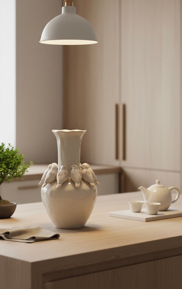 Deze verfijnde vaas is een kunstwerk vol karakter en charme. Het zachte koraal-glazuur en de speelse vogeltjes rondom de hals geven het stuk een warme, natuurlijke uitstraling.